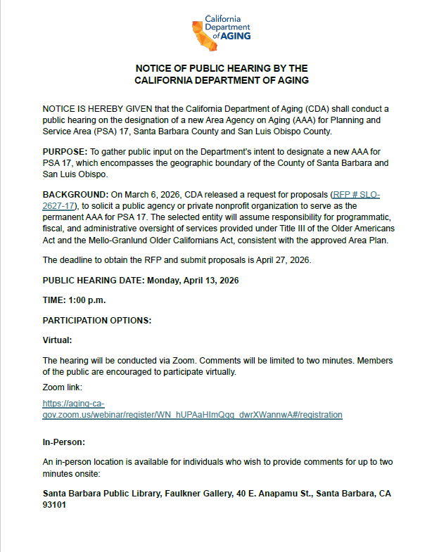Applications for these services will be available at the Applicants’ Conference Friday, February 28th, 2025, at 2pm in-person at the office of the Area Agency on Aging 528 South Broadway, Santa Maria CA 93454. A ZOOM link will be available upon request. For additional information, contact Ed Bill, Contracts Manager Area Agency on Aging (805) 925-9554, option 6; Or Ed.Bill@centralcoastseniors.org