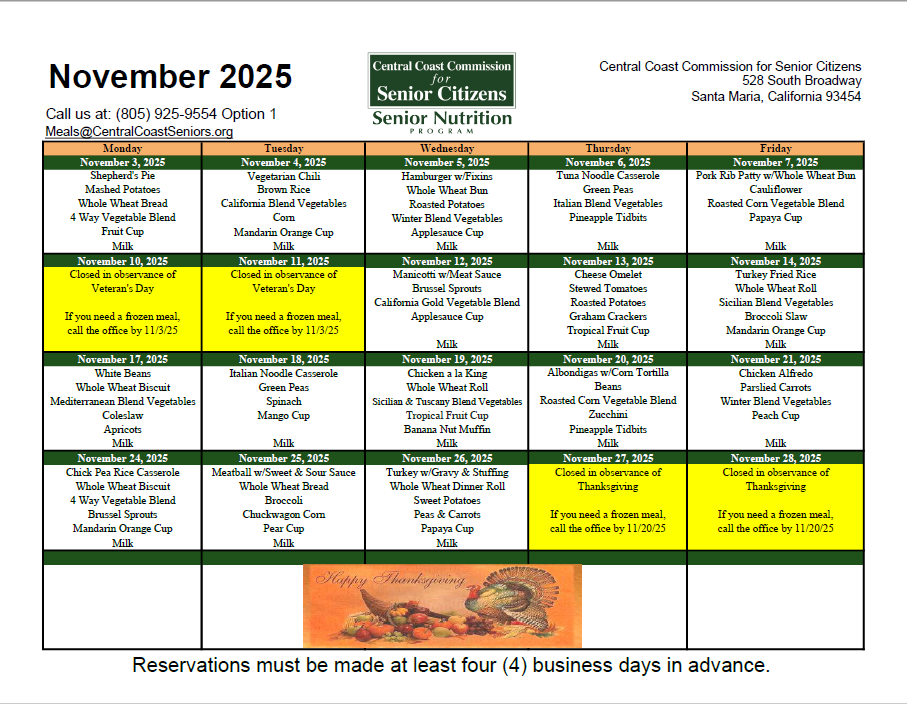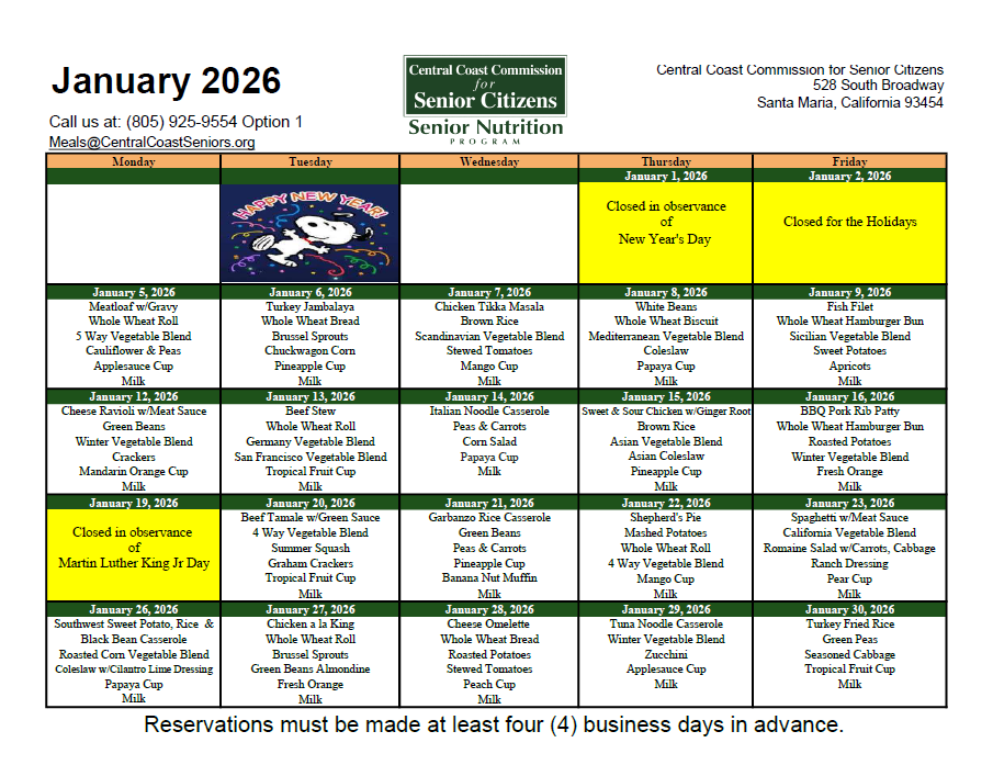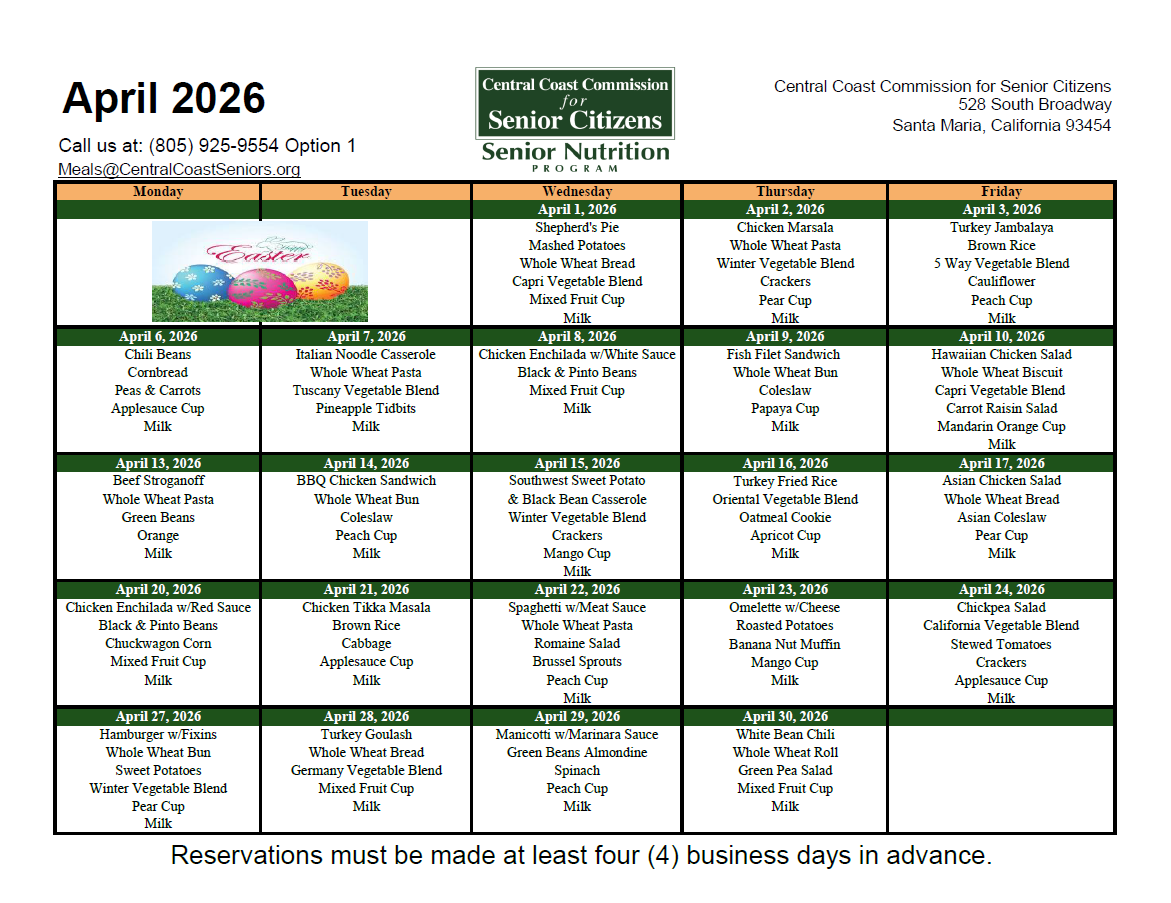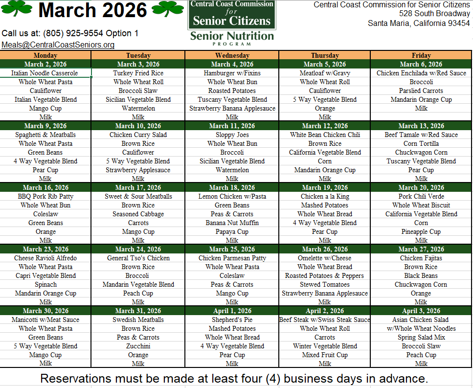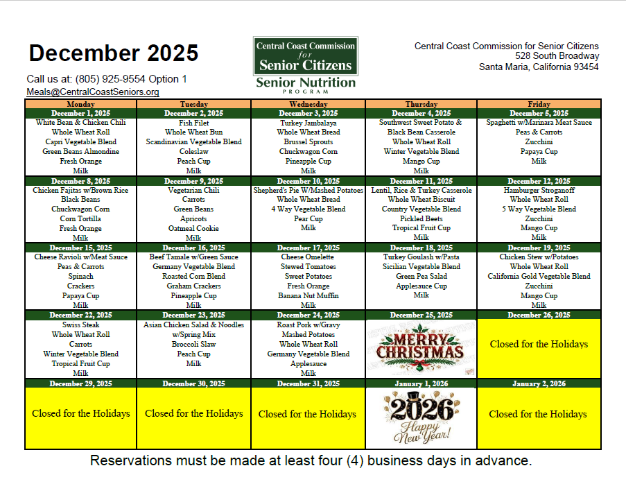 You must be registered and have a reservation to receive a meal (call 805–925-9554, Option 1 to reserve a meal). Please see out menu below: